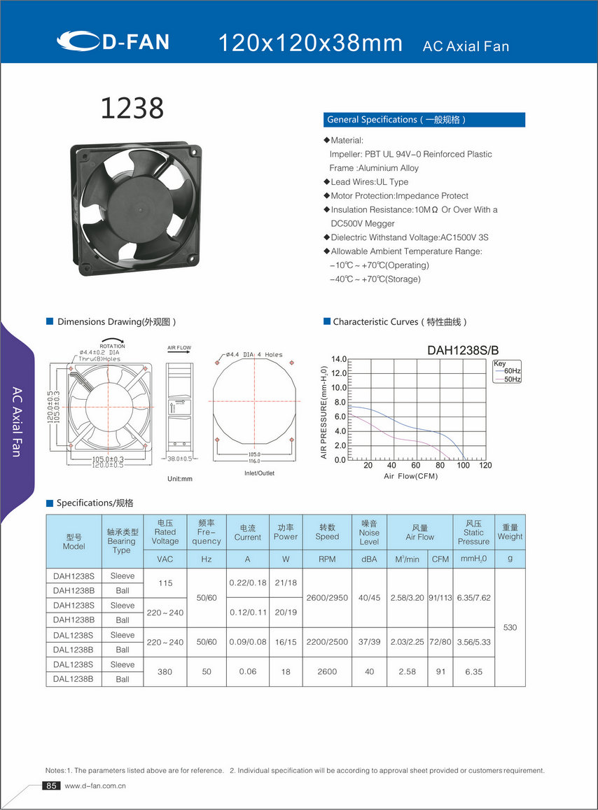材料: 叶轮:PBT UL 94V-0增强塑料框架铝合金 导线:UL型 电机保护:阻抗保护 绝缘电阻:1欧姆或以上,带DC500V高阻表 介电耐压:AC1500V 3S 允许环境温度范围: -10℃-+70℃(运行) -40℃-+70℃(储存)